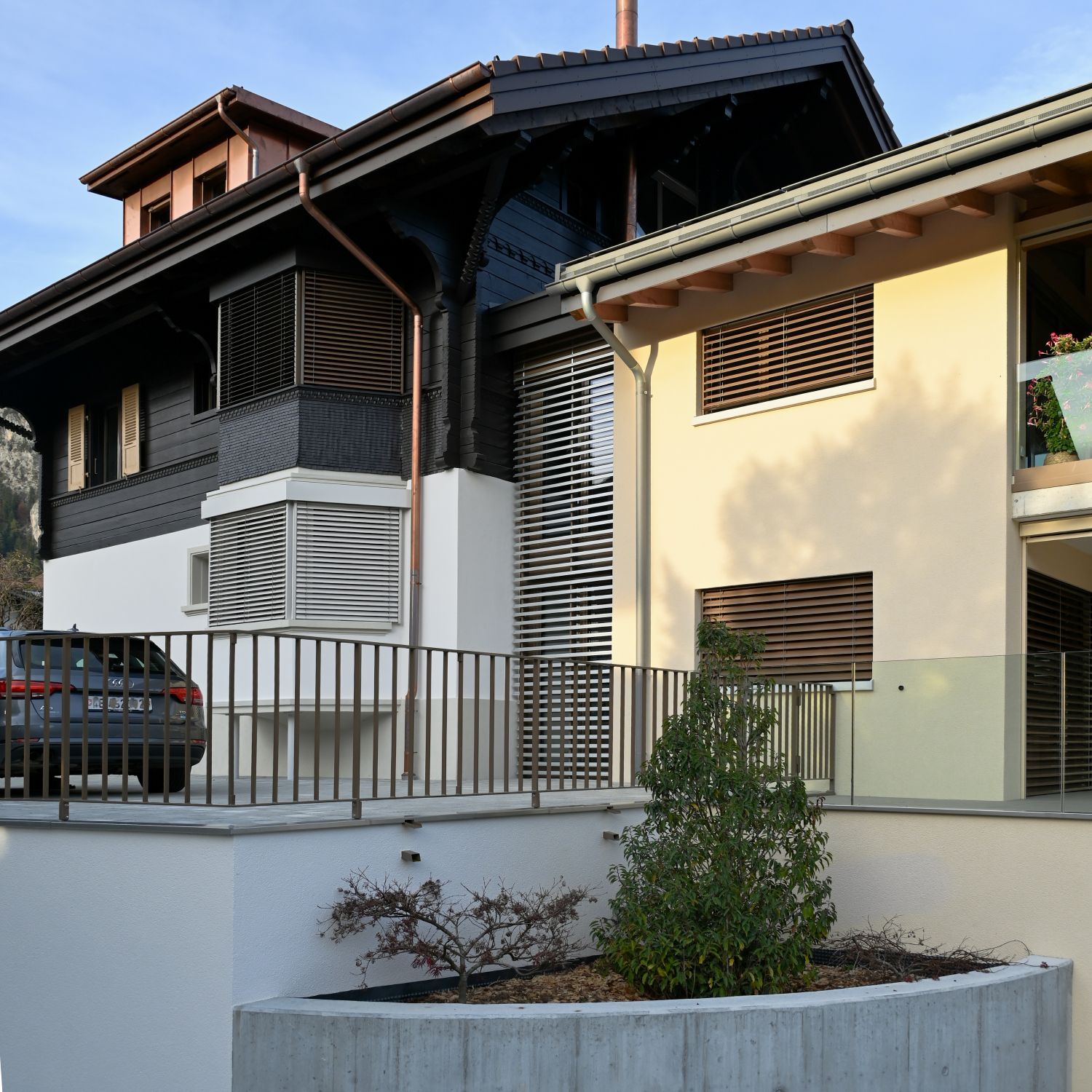 Erweiterung Altbau und neuer Anbau. Drei Wohnungen und private Tiefgarage.