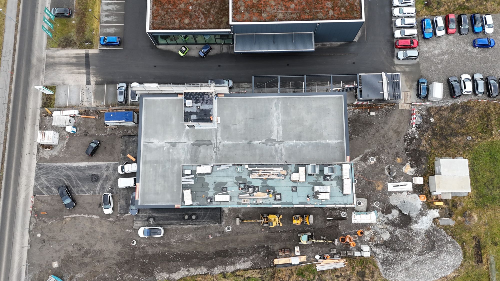 Werkstattgebäude mit Autolackiererei, verschiedenen Werkstattplätzen und Bürotrakt. Parkdeck und PV-Anlage.